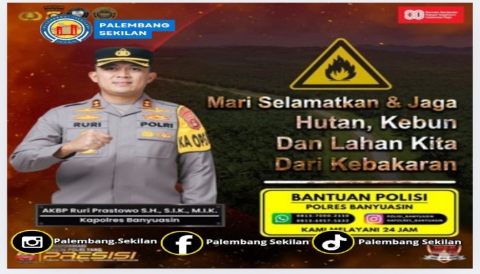 Banyuasin, PS – Menyikapi meningkatnya risiko kebakaran hutan dan lahan (karhutla) saat musim kemarau, Kapolres Banyuasin AKBP Ruri Prastowo, S.H., S.I.K., M.I.K., mengeluarkan imbauan resmi kepada seluruh masyarakat untuk lebih waspada dan bertanggung jawab terhadap lingkungan.