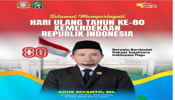 Banyuasin, PSCOM– Dalam rangka memperingati Hari Ulang Tahun (HUT) ke-80 Kemerdekaan Republik Indonesia, Anggota DPRD Kabupaten Banyuasin dari Fraksi Partai Kebangkitan Bangsa (PKB), Agus Riyanto, SH, menyampaikan pesan kebangsaan yang sarat makna. Menurutnya, momentum kemerdekaan harus menjadi ajang untuk memperkuat persatuan, menjaga kedaulatan, serta menghadirkan kesejahteraan bagi rakyat.