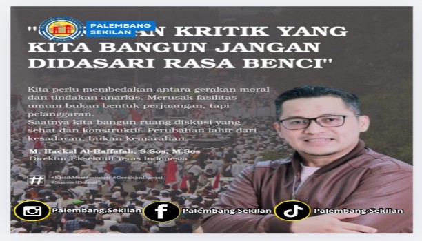 Palembang, Pscom – Di tengah meningkatnya eskalasi dinamika sosial dan gelombang kritik yang terus mengalir, sebuah seruan lantang datang dari Direktur Eksekutif Teras Indonesia, M. Haekal Al-Haffafh, S.Sos., M.Sos. Ia menegaskan bahwa gerakan kritik di masyarakat harus dibangun di atas fondasi kesadaran, bukan kebencian.