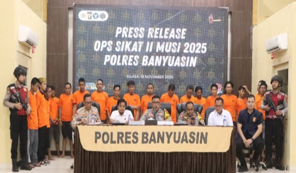 BANYUASIN, PSCOM – Polres Banyuasin kembali menunjukkan taringnya dalam memberantas kejahatan melalui Operasi Sikat II Musi 2025. Selama 15 hari pelaksanaan, mulai 30 Oktober hingga 13 November 2025, jajaran Polres berhasil mengungkap puluhan kasus kriminal lintas kategori dengan total puluhan tersangka diamankan.