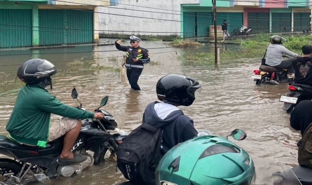 Tak hanya mengatur lalu lintas, personil yang bertugas juga sigap membantu masyarakat yang kendaraannya mogok akibat menerjang banjir. Beberapa sepeda motor terlihat didorong petugas ke tempat yang lebih aman dan kering.